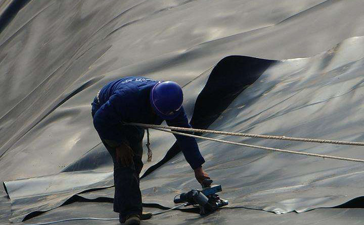 底部土工膜應(yīng)盡快與邊坡上土工膜連接上,防止下雨時,雨水倒灌進入土工膜焊接成品的下面。底部土工膜的鋪焊是在邊坡土工膜鋪焊完成之后進行的。按裁好的土工膜尺寸,一幅一幅鋪設(shè),做好記錄。在鋪設(shè)土工膜時,應(yīng)邊鋪邊焊,當(dāng)天鋪設(shè)當(dāng)天焊完。