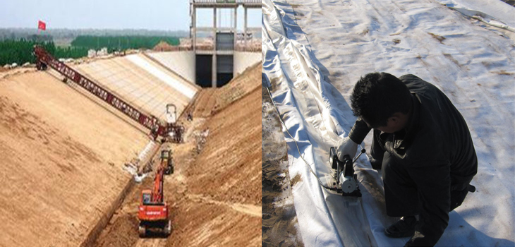 土工膜在搬運(yùn)過程防止尖銳物體損傷膜;膜的裁剪寬度是根據(jù)坡面長度加上溝槽深寬度和上坡面水平面的壓實(shí)寬度,根據(jù)蓄水深度用勾股定理計(jì)算坡面長度,一般溝槽埋壓40cm,水平面壓30cm即可,三者相加即裁剪寬度,現(xiàn)場裁剪施工時(shí)場地要平整,同時(shí)避免有風(fēng)雨天氣,由于池塘周長的關(guān)系,一般都需進(jìn)行拼接,拼接方法有焊接、縫接、粘接三種,焊接需要有專業(yè)焊接機(jī)和專業(yè)人員施工,粘接需要特殊膠粘劑,兩者在現(xiàn)場施工較為繁瑣,實(shí)際操作基本采用縫接方法,用聚乙烯線機(jī)器或手工縫接即可,縫接采取相嵌式。