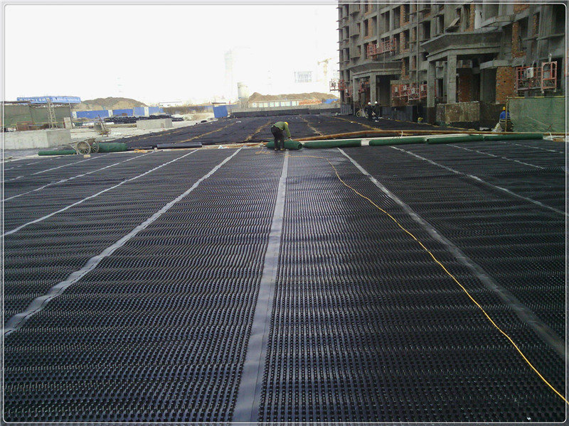 排水層的傳統(tǒng)構造是采用厚度不小于100mm的卵石、碎石或陶粒,其中陶粒的通水性能略遜于前二者,傳統(tǒng)做法對屋面結(jié)構會產(chǎn)生較大的承載壓力。隨著部分外資工程的建設,(蓄)排水板從歐美引入我國,憑借其重量輕、施工便捷、造價低的優(yōu)勢逐漸成為(蓄)排水層的主流用料。(蓄)排水板又分為網(wǎng)格交織型和凹凸型兩種,其中由于常規(guī)的凹凸型(蓄)排水板售價略低并兼具一定的蓄水性能,目前應用相對較多。